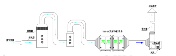 廢氣收集-噴淋塔-活性炭吸附箱/UV光解-防腐風(fēng)機-達(dá)標排放