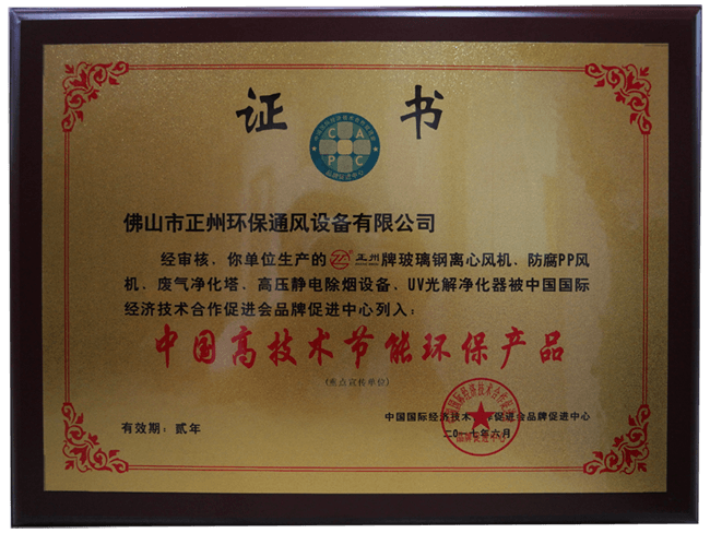 2017年7月,佛山91九色蝌蚪玻璃鋼風機廠就好像外麵的太陽,熱(rè)火朝(cháo)天。好事一波(bō)接一波,先是通過了2016年度重合同守信(xìn)用單,現在又通過了高技術產品認證,並獲得(dé)高技術產品(pǐn)證書。此次佛山91九色蝌蚪環保生(shēng)產(chǎn)的(de)玻璃鋼離心風(fēng)機、防腐pp風機、廢氣淨化塔、高壓靜(jìng)電除煙設備、UV光解淨(jìng)化器被中國國際經濟技術合作品牌(pái)視為核心列入了中國高技術節能環保產品!建立起頂端品(pǐn)牌一直是佛(fó)山正(zhèng)州環(huán)保努力的目標!隨著企業的不斷發展,佛山91九色蝌蚪環保不斷擴大生產規模,完善玻璃鋼離心風機、廢氣淨化塔、UV光(guāng)解淨化器等產品(pǐn)的功能和品質(zhì),並受到了中國品牌視為核心(xīn)的承認。這標誌著佛山(shān)91九色蝌蚪環保這個品牌是廢氣處(chù)理(lǐ)設備高技術(shù)節能環保產品的一(yī)大品牌。