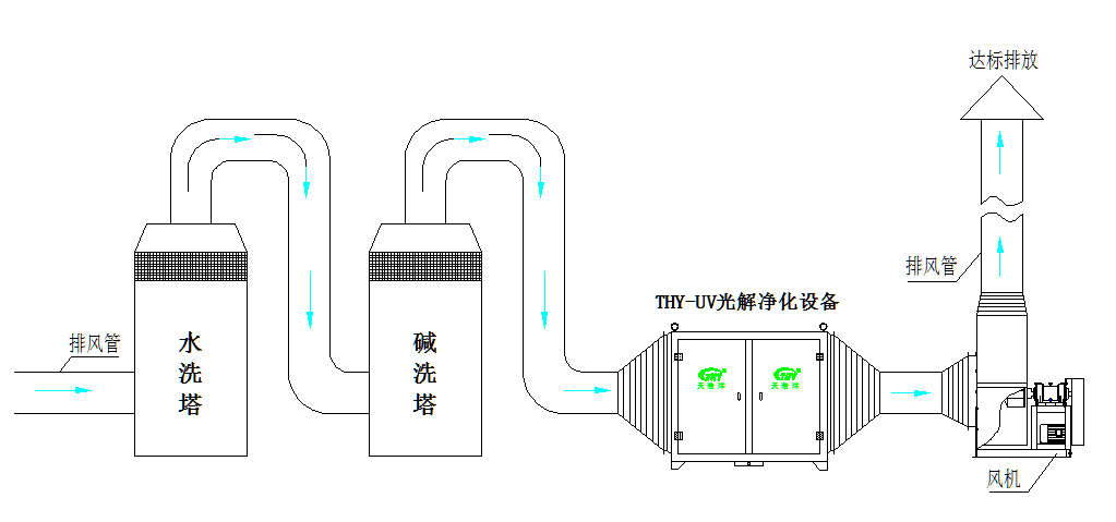 化工廢氣處理考慮運營成本及安全(quán)性,本(běn)方案工藝路線擬定(dìng)采用“通風係統(風機、收集(jí)罩、管道)+預處理係統(水(shuǐ)噴(pēn)淋塔+堿(jiǎn)洗塔)+核心淨(jìng)化係統(UV光解淨化設備)”來進行化工廢氣處理。工藝(yì)設備圖如下(xià):